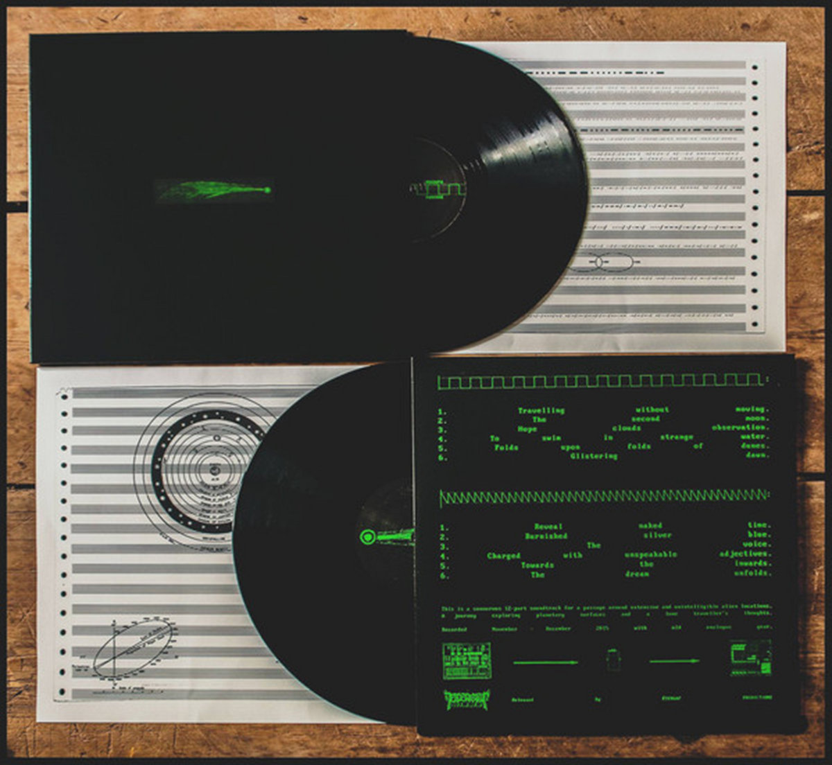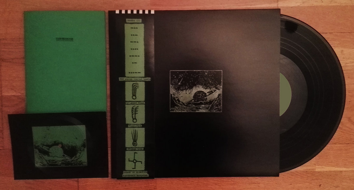 -12" vinyl, housed in black sleeves with handstamped artwork in green metallic ink